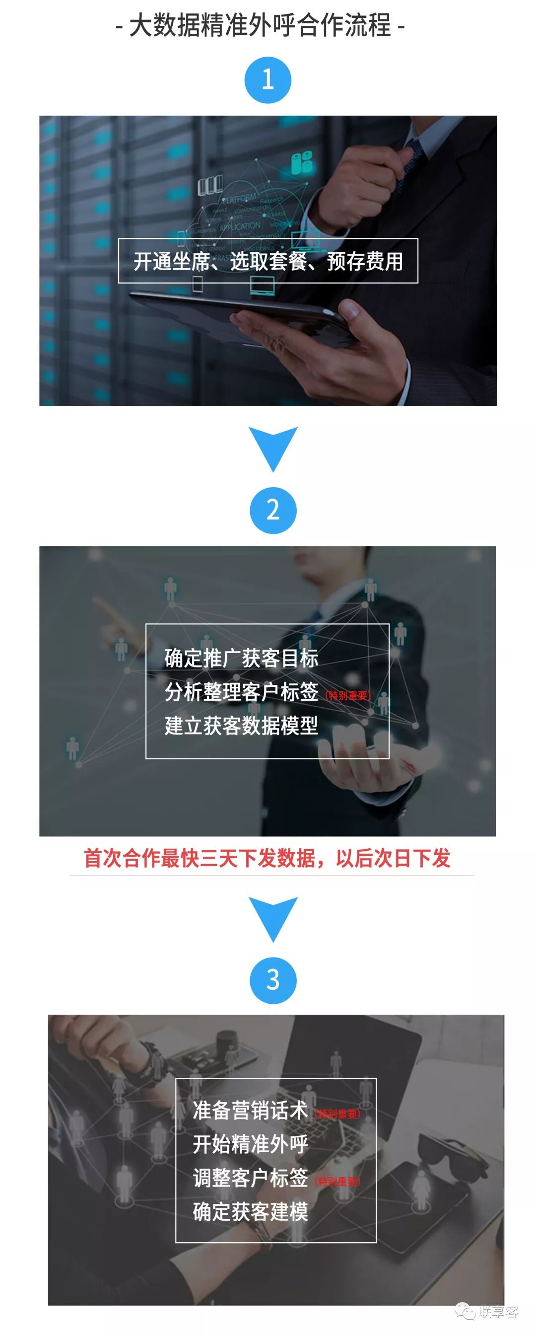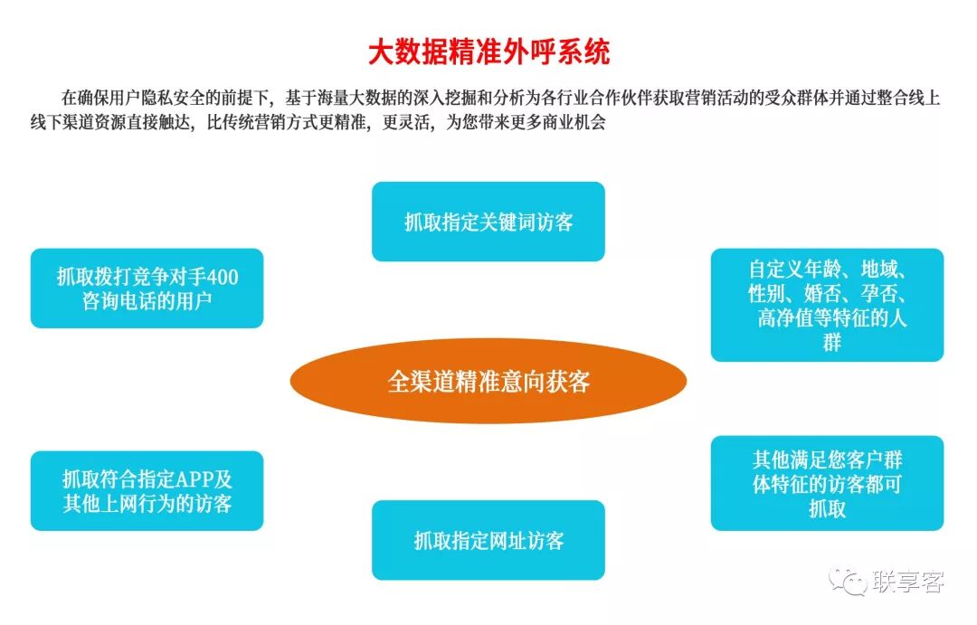 方法一:关注“联享客”公众号,选择大数据获客,申请坐席,选择相应套餐付款,联系客服,分析客户画像,建立获客模型。
